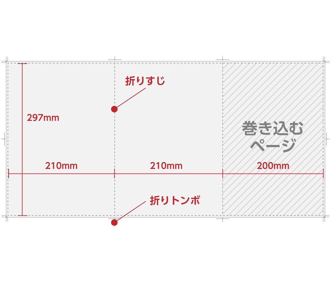三つ折り以上の場合、折り込む部分のページは10mm短く制作してください。