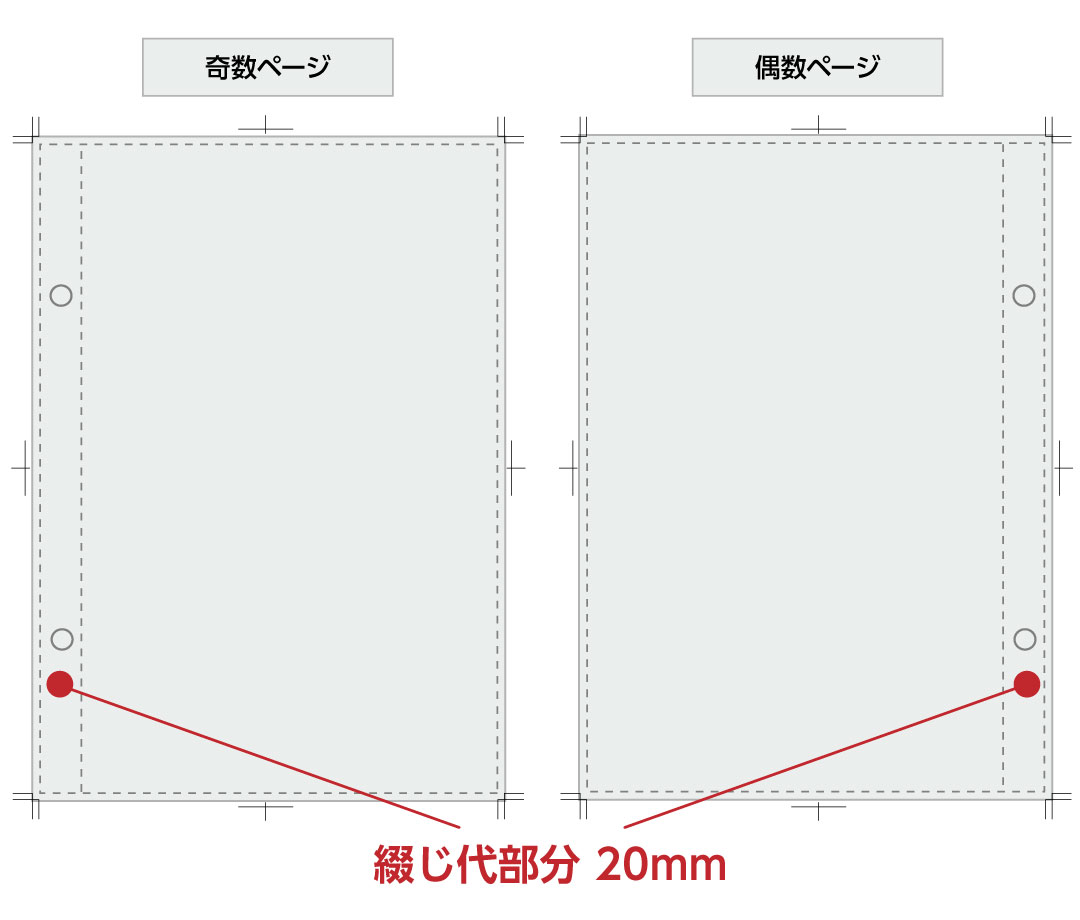綴じ代は端から20㎜の位置、折りスジが入ります。