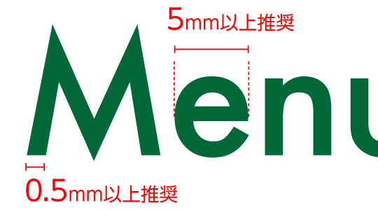 一文字、5mm角以上が推奨です。小さな文字は潰れてしまう可能性がございます。