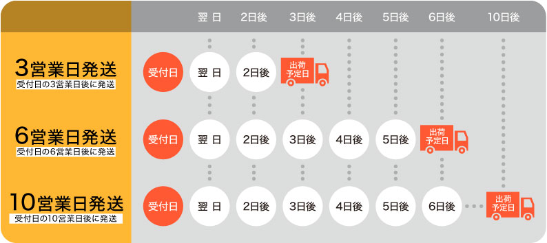ご注文時に選択した納期日数(10営業日なら10日目)に発送となります。
