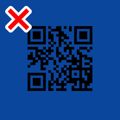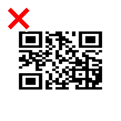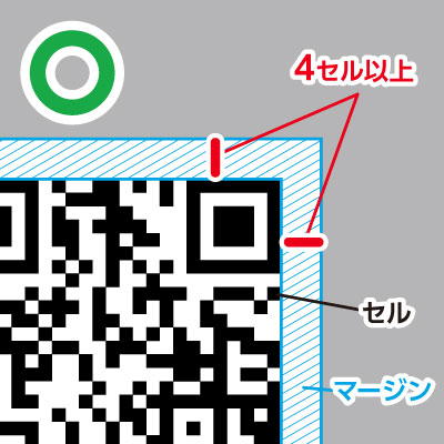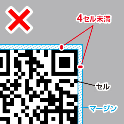 QRコードの周囲には十分な余白(マージン、クワイエットゾーン)が必要です。 余白は、コード全体の4セル分以上確保して下さい。この余白がないと、QRコードの境界を認識できず、読み取りエラーが発生します。