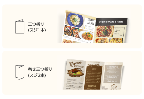 B4/A3サイズ = 二つ折り(スジ1本) / 巻三つ折り(スジ2本)