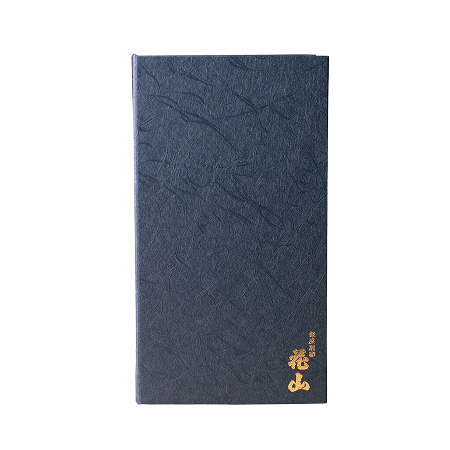 花山うどんの歴史を物語る上質な空間に調和する、濃紺のクロスと金色のロゴで気品ある佇まいと華やかさを細部まで追求しています。