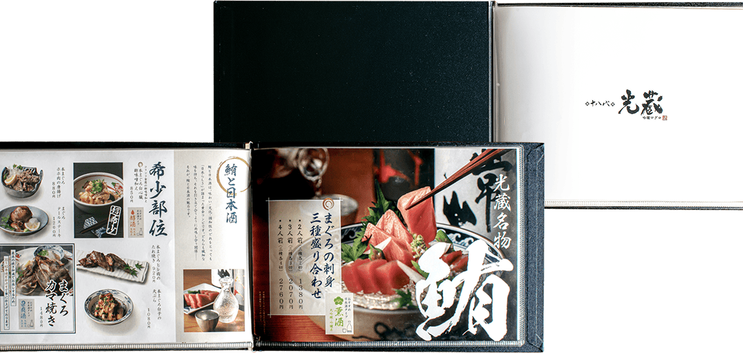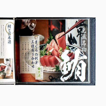 日本酒のお供には看板の本マグロ。ネタケースに入った毎日仕入れる厳選の食材を、刺身・寿司・炙りなど多彩な楽しみ方をメニューでも視覚的に訴求します。