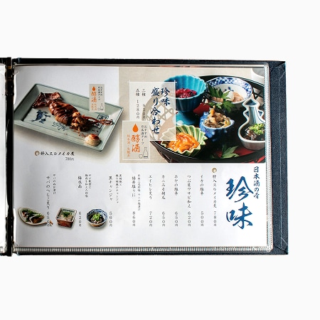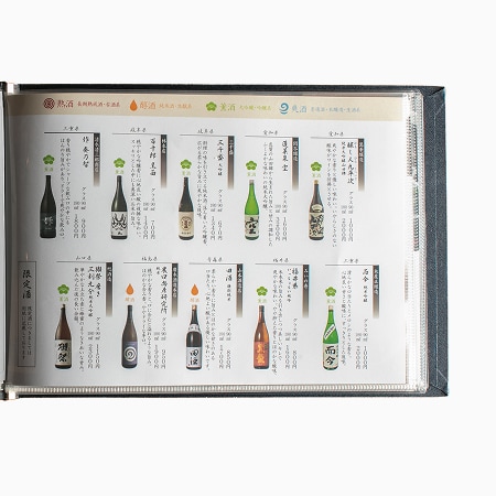 縦書きレイアウトに合わせた右綴じ仕様。おすすめ日本酒の入れ替えに対応できるよう、差し替えが容易なピン留めのビニールポケットで運用性と美観を両立。