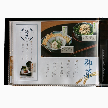 濃紺の和メニューで旬を粋にご案内。