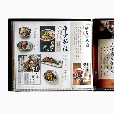 表紙と同素材の濃紺クロスで内張りまで仕立て、上質感を一段と強調。 和の空気感に合うファンシーペーパーで印刷することで、 紙の素材感とメニューの世界観が一体化します。