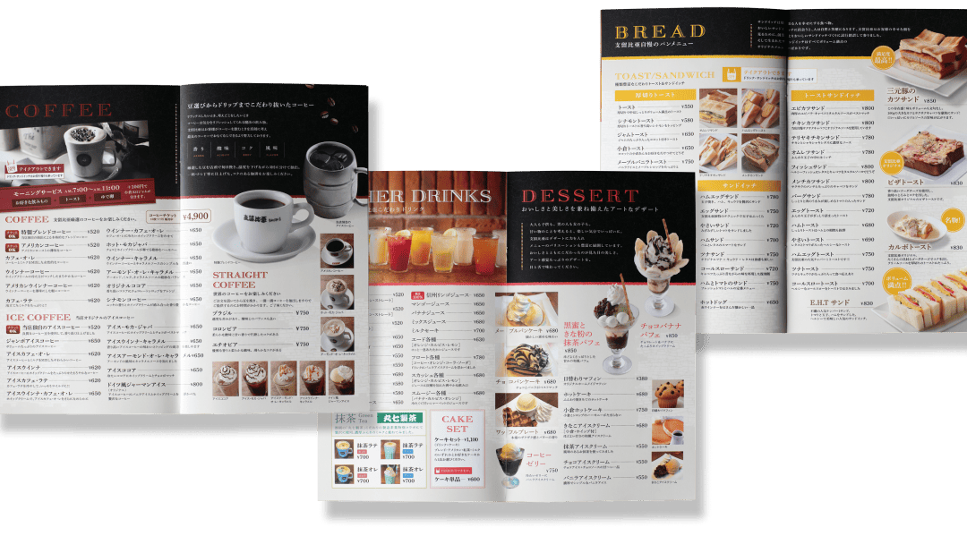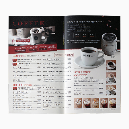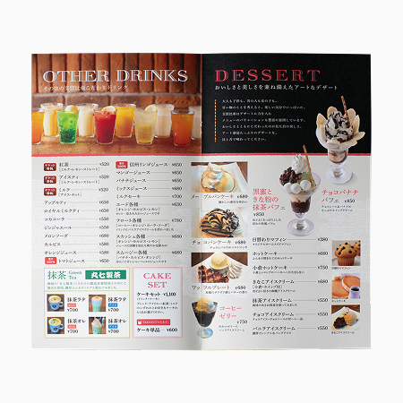 中面はドリンク3ページ、デザート1ページ、フード2ページで構成。大きくてキレイな写真をふんだんに使い、華やかで食欲をそそるレイアウトに。