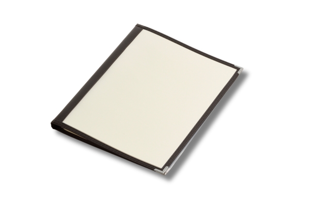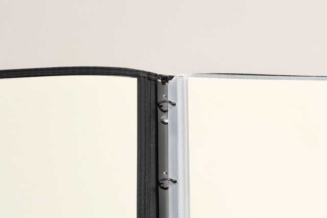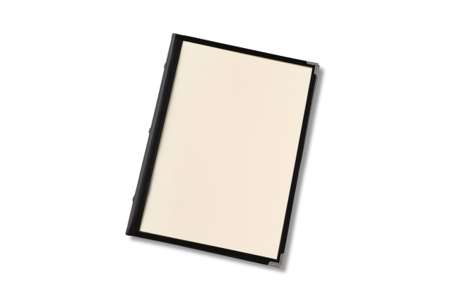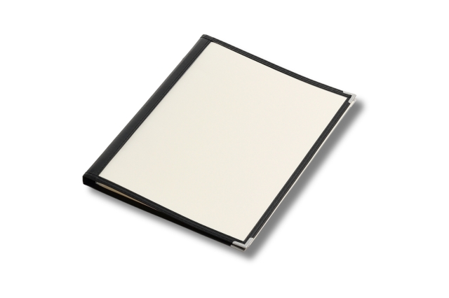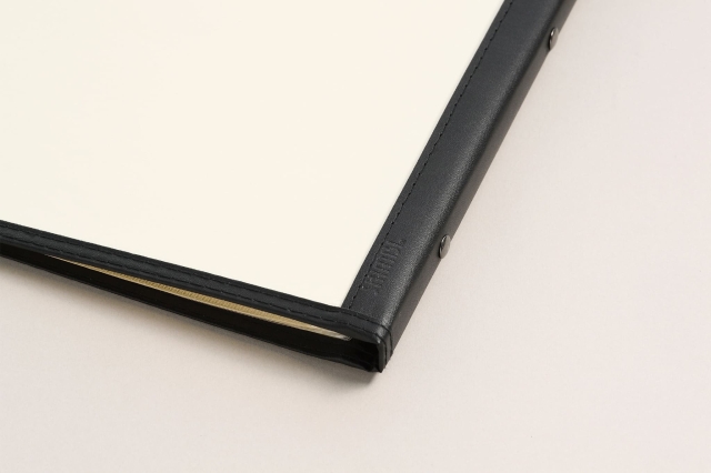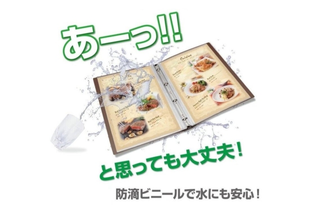 幅12mmのスリムバインダー仕様で防滴ビニールポケットをワンタッチで増減が可能。水濡れにも安心の防滴クリアテーピングメニュー(A4サイズ)。