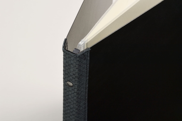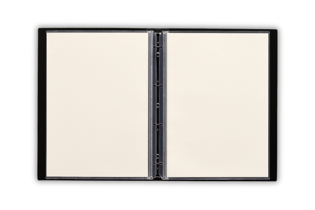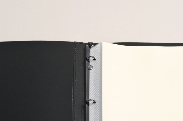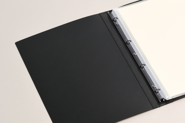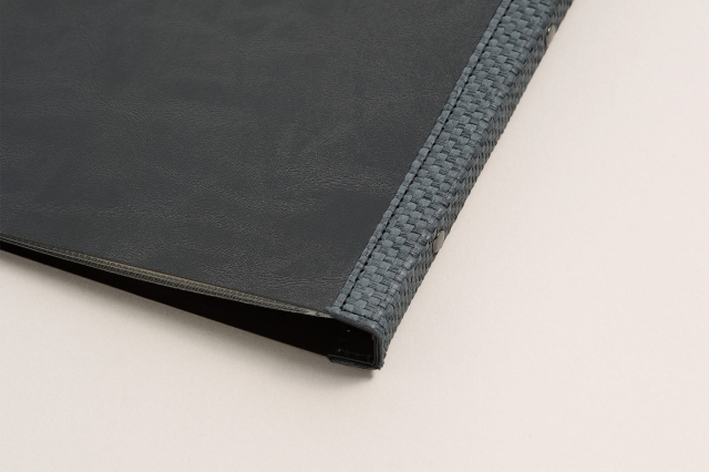 スマートな幅12mmのスリムバインダー仕様。水濡れや汚れにも安心の防滴チャックつきビニールポケットをワンタッチで増減が可能。※スリムB-LU-BTとはメニュー背の部分の素材が異なります。