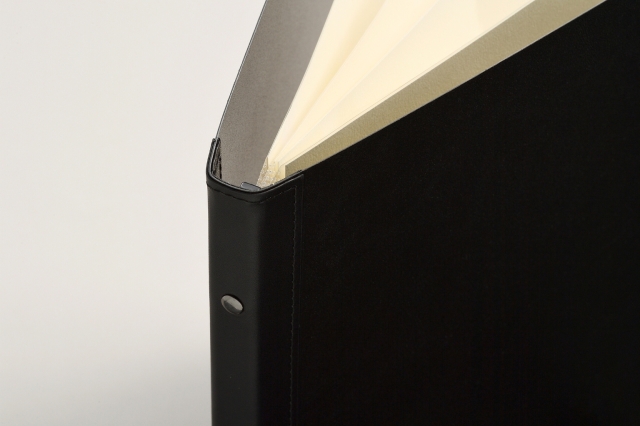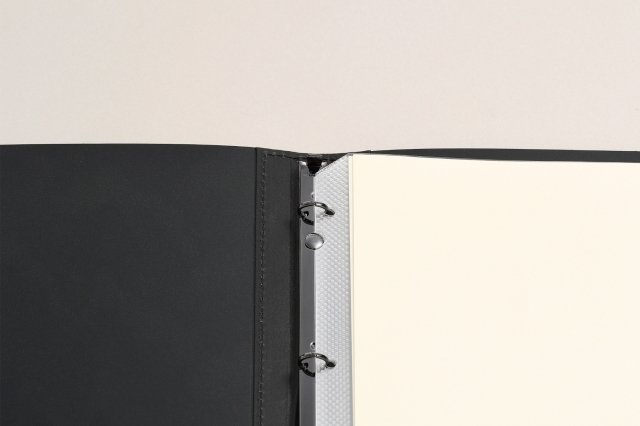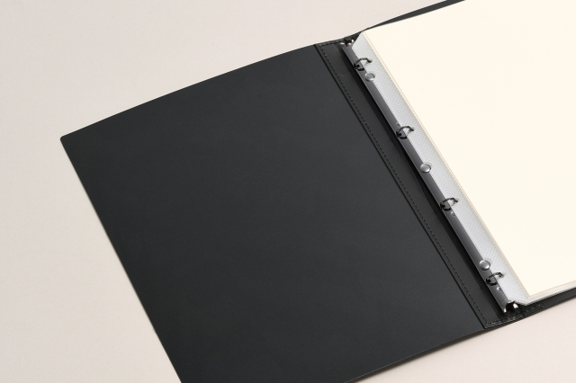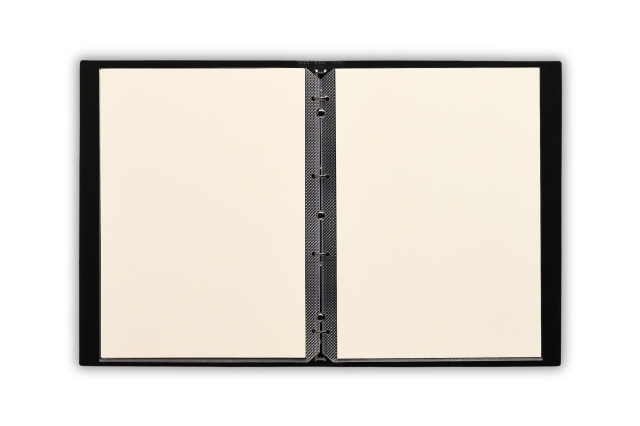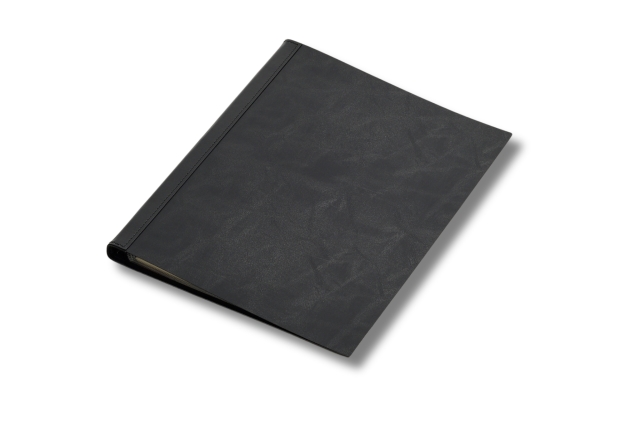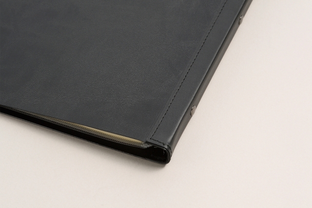 幅12mmスリムバインダー仕様で手軽にワンタッチでページの増減が可能。水にも汚れにも強い素材で背表紙のレザー調素材のアクセントがオシャレなメニュー。※スリムB-LUPとはメニュー背の部分の素材が異なります。